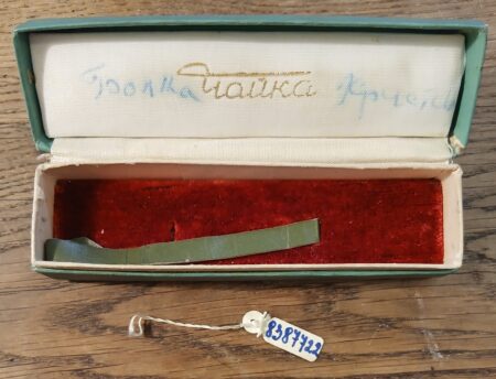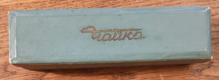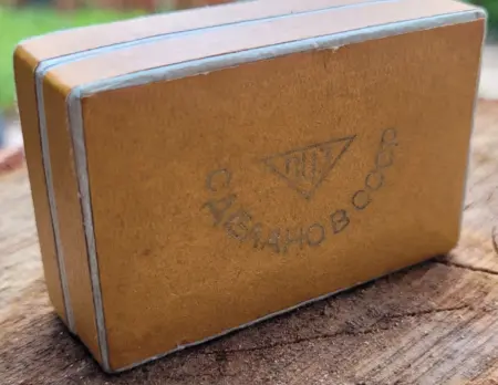 Une boîte rectangulaire en carton avec le logo triangulaire des années ’50 de la fabrique de Penza (photos: ebay):
