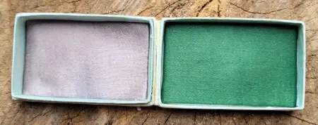 Un boîte carrée en carton rouge (5cm X 5cm X 2,3cm) avec inscrit en doré la marque ЗАРЯ (Zaria) et la marque de qualité de l’URSS: