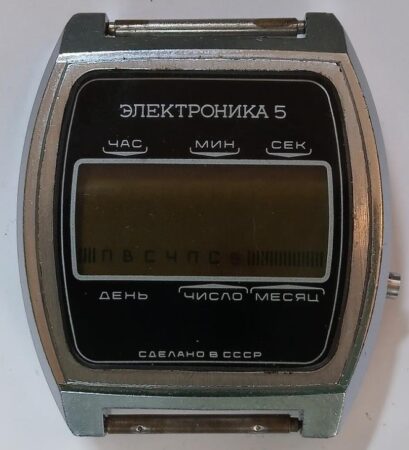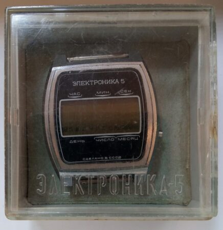 Avec sa boîte (base de plastique gris, couvercle de plastique transparent marqué Электроника 5