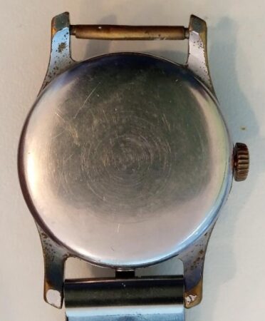 Bracelet métallique soviétique estampé « 3p80k » (3 roubles 80 kopeks), à la boucle extensible et qui se fixe autour des pompes par des lames-ressorts.