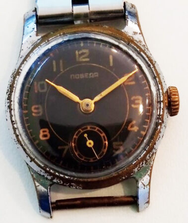 Mentions sur le calibre : 1-58 (1er trimestre 1958) et n° de série (25364) sur un pont,15 камней et logo de la 2e Fabrique de Montres de Moscou (Ч2З dans un demi rouage) sur un autre, Победа et trois étoiles sur le rochet, côtes de Genève.