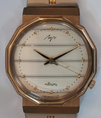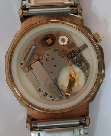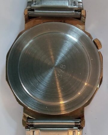 Boîtier : Laiton plaqué or (poinçon AU sur le bord droit) avec un encadrement du verre à douze côtés, le remontoir est à quatre heures