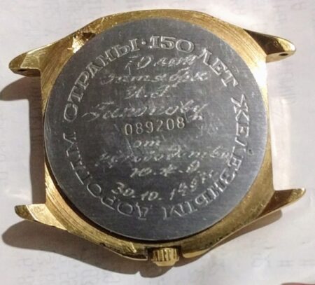 L’inscription du fond de boîtier est : 150 лет железным дорогам страны (150 ans des chemins de fer nationaux)