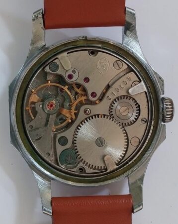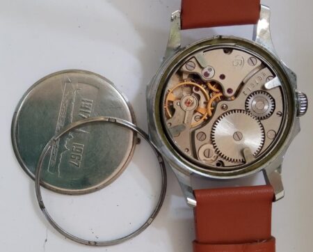 Mentions sur le calibre : n° de série (867813) sur un pont, logo Vostok (B dans un cercle) sur un autre