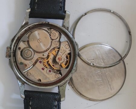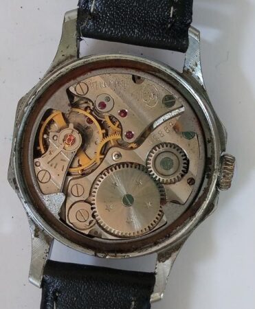Mentions sur le calibre : n° de série (38830) sur un pont, logo Vostok (B dans un cercle) et v sur un autre