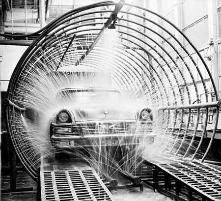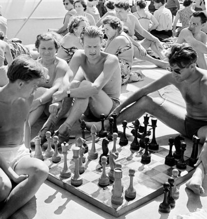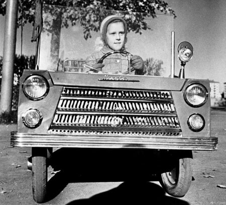 À partir de 1946, il a capturé la reprise d’après-guerre du pays, son avancement industriel et agricole, les festivals de Moscou, les voyages à l’étranger et bien plus encore qui constituaient la vie du grand pays. Khoukhlaev met l’accent sur les événements de sport automobile, les vacances dans l’aviation et la marine, les constructeurs automobiles et les transports – tout ce qui touche au thème du mouvement. Dynamique, rapidité, risque constituent le moteur de sa photographie, révélant le plus le caractère du photographe.
