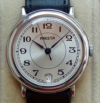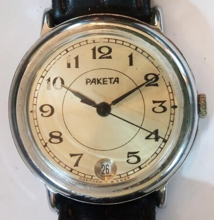 Mentions sur le calibre : 2614.H et SU sur le pont, logo Raketa (raquette symbolisée) sur la platine.