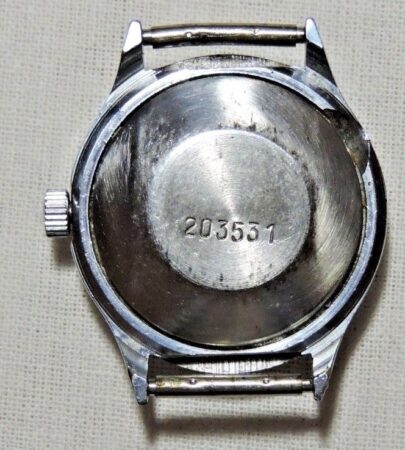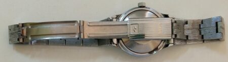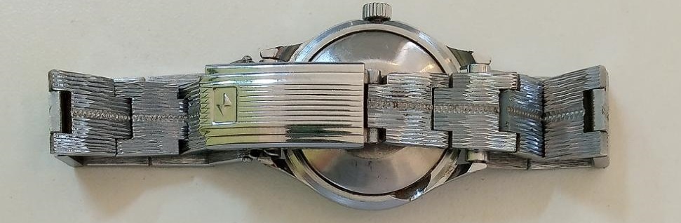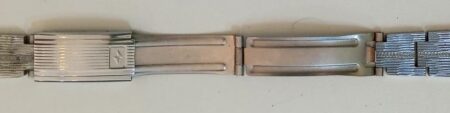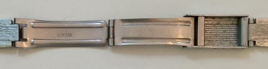 Beau bracelet métallique soviétique aux maillons striés, à boucle déployante frappée de l’insigne de la Fabrique de Pièces de Montres de Vitebsk avec à l’intérieur de la boucle cette indication : Ч.3P.50K (prix : 3 roubles 50 kopecks).