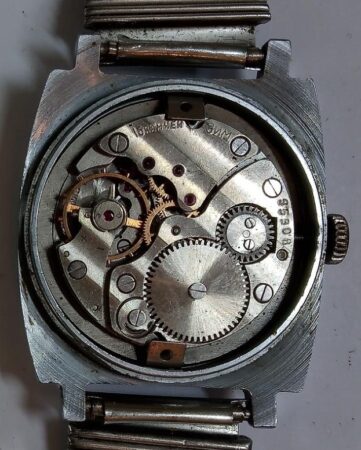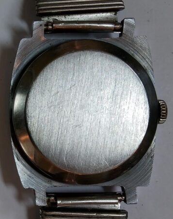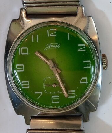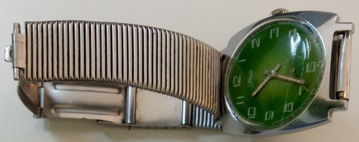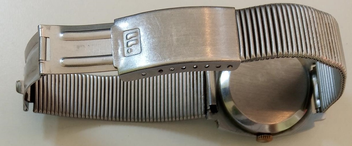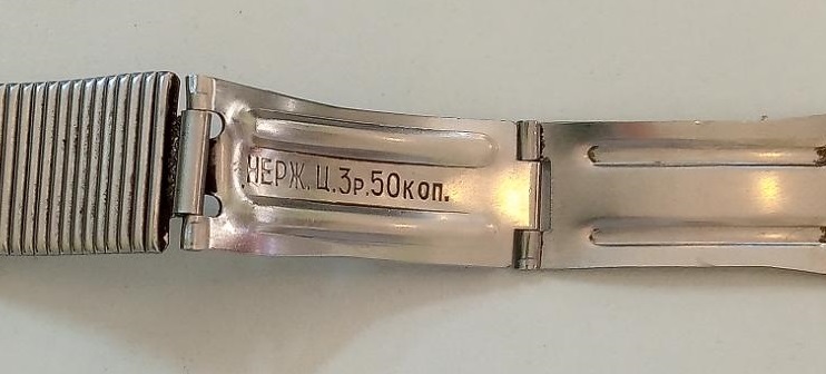 Bracelet métallique soviétique à boucle déployante, strié à l’extérieur et estampée du logo de la Fabrique « Pult » de Chebekino, de la mention нерж (inox) et Ц3P.50K ( prix 3 roubles 50 kopecks).