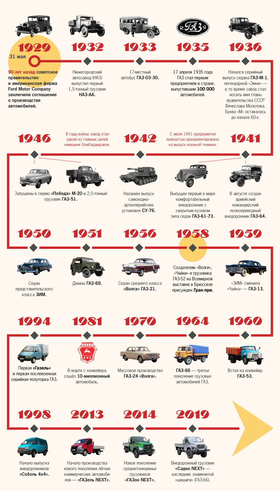 Le 31 mai 1929, le Conseil Suprême de l’Economie Nationale de l’URSS et la société américaine Ford Motor Company conclurent un accord ayant trait à la mise en place de la production en série de voitures, la Ford A, et de camions, le Ford AA. Le choix de la ville de Gorki (Nijni-Novgorod avant 1932 et après 1991) est motivée par ses facilités de transport : proche de Moscou, au bord de la Volga et de l’Oka, grand nœud ferroviaire. L’usine fut étudiée par le bureau d’architecture américain d’Albert Kahn (1869-1942) qui conçut 521 usines pendant le premier plan quinquennal soviétique.