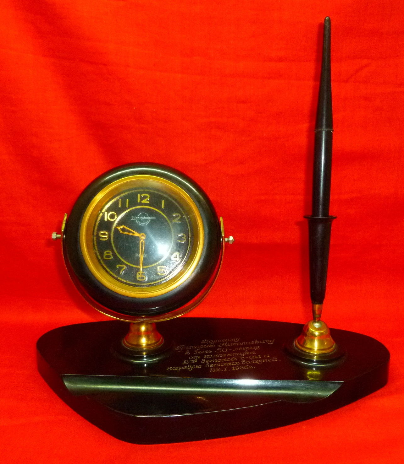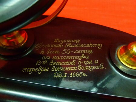 « Pour le cher Grigori Nikolaïevitch, pour ses 50 ans, de ses collègues du 2e Hôpital pour enfants et du Département des maladies infantiles. 22 janvier 1965″ (horloge de Zlatoust)