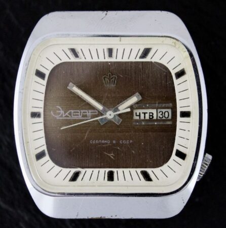 En 1979, la 1ère Fabrique de Montres de Moscou commence la production de montres emboîtant le 3050 dans un boitier avec une couronne à 4 heures, et leur attribue la marque Ekvar (Эквар), une contraction d’Electronique et de Quartz (Электронные et Кварцевые).