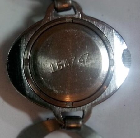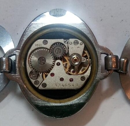 Mentions sur le calibre : N° de série sur un pont, 1601 sur un autre, logo de la 2e Fabrique de montres de Moscou sur la platine