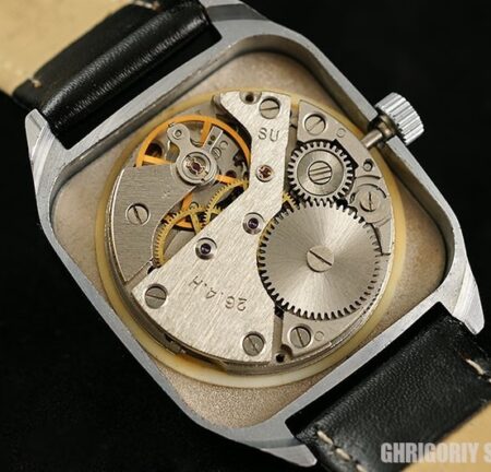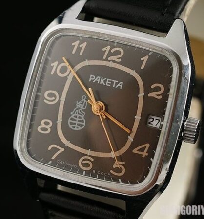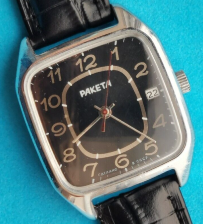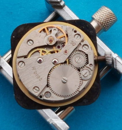 Mentions sur le calibre : 2614.H et SU (Soviet Union) sur le pont, logo raketa (raquette symbolisée) sur la platine.