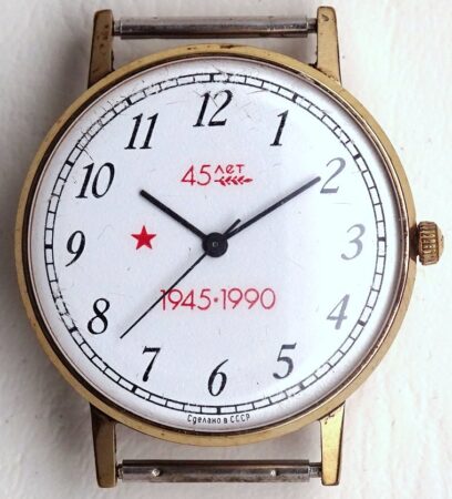 Inscriptions commémoratives « 45 лет » avec un rameau d’olivier, une étoile et « 1945-1990 » en rouge.