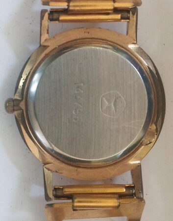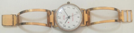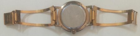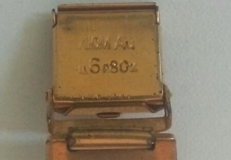 Beau bracelet métallique doré ajouré, d’époque et de fabrication soviétique, à boucle papillon, avec comme mention ЛЮМ Au sur une ligne et «Ч6P.80K » (prix 6 roubles 80 kopeks) sur la ligne du dessous. Strie à l’extérieur de la boucle.