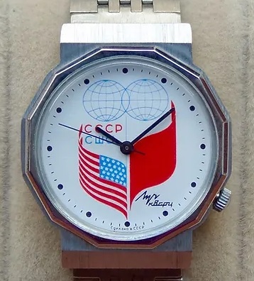Motif de drapeau soviétique et américain surmontés des initiales des deux pays (en cyrillique) et d’une planisphère.