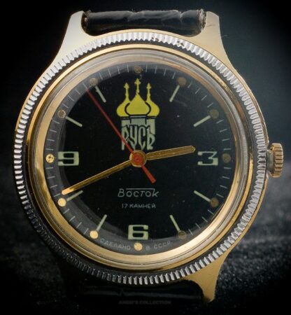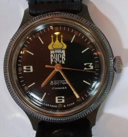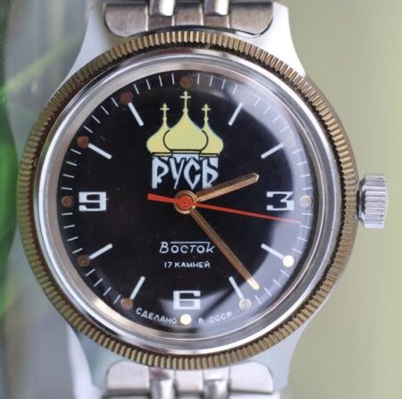 Русь (Russ’) est un mot des langues russe, ukrainienne et biélorusse désignant l’État qui était celui des Slaves orientaux du Xᵉ au XIIIᵉ siècle. Un cadran similaire se retrouve sur les Komandirskie « kadet » 2409A/059650. Datant de la fin des années ’80, cette montre commémore probablement le millénaire de l’orthodoxie. En 988 en effet, le prince Vladimir de Kiev, qui régnait sur la Rouss’ ou Russ’, se convertissait à l’orthodoxie, religion de l’empire byzantin. L’orthodoxie allait devenir un ciment de l’identité nationale russe, notamment pendant les siècles qui suivirent marqués par la domination tartare/mongole/musulmane. La conversion de Vladimir a eu dans l’imaginaire national russe la place qu’a pu avoir le baptême de Clovis en France.