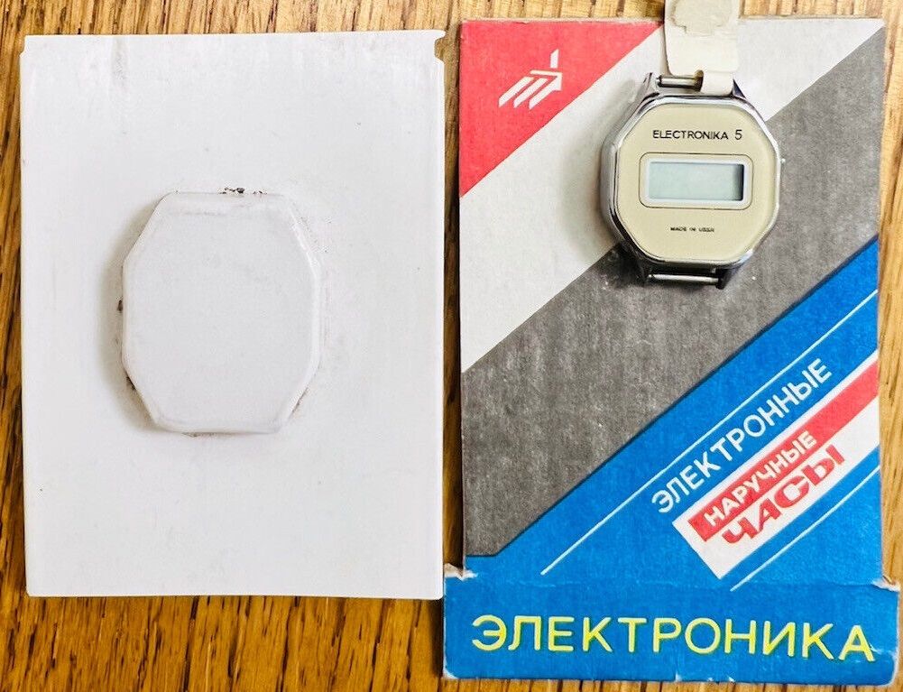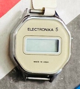 Ce modèle pour l’exportation porte la mention ЭЛЕКТРОНИКА 5 sur le cadran. Le modèle pour le marché intérieur (voir ici) ne porte que le logo de la fabrique Elektronika.