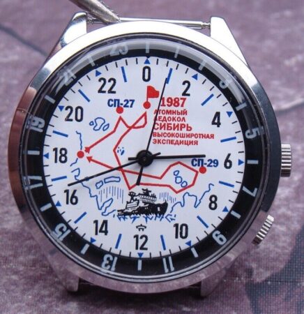 En 1987, le « Sibir » a effectué un trajet sans précédent dans les hautes latitudes pour prendre à bord le personnel de la station scientifique en dérive SP-27 et en déployer une autre, SP-29, avant d’atteindre le pôle Nord à des fins scientifiques. C’est le motif du cadran, c’est aussi ce qui est célébré par ce timbre: