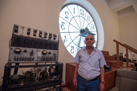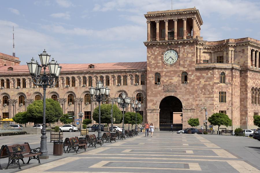 L’horloge principale d’Erevan se trouve sur la tour du bâtiment du gouvernement, et a été installée en 1941. Elle horloge fonctionne sans interruption pendant 77 ans. Le diamètre de la montre est de 3 m 60 cm, la grande aiguille d’une longueur de 170 cm pèse 4 kg 850 g, et la petite aiguille d’une longueur de 110 cm pèse 3 kg 500 g. L’auteur du projet est Magnishevsk. L’horloge a été installée sur la tour par le maître horloger Artsrun Yavroian, qui l’a entretenue jusqu’en 1985. Lui ont succédé les maîtres horlogers Gegham et Lyova (photo).