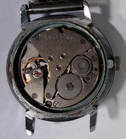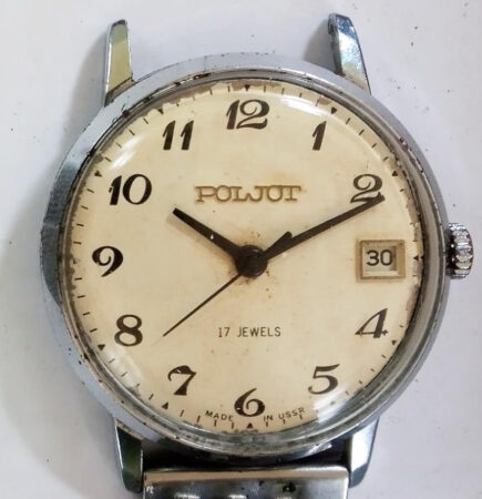 Mentions sur le calibre : dernier logo Poljot (couronne) sur la platine, SEVETEEN 17 JEWELS, SU, et 2614.2H sur le pont.