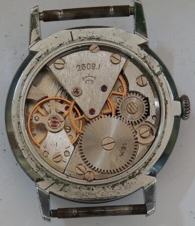 Mentions sur le calibre : n° de série (44540) sur la platine, logo de Raketa (la raquette symbolisée) et 2609.1 sur le pont, n° de série sur la platine
