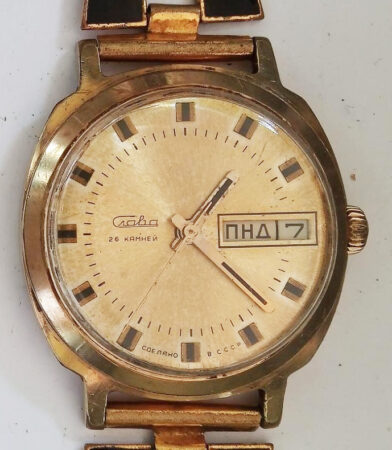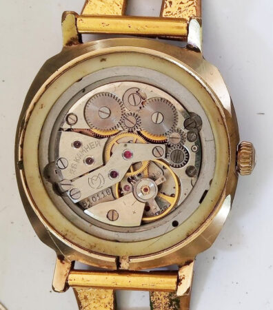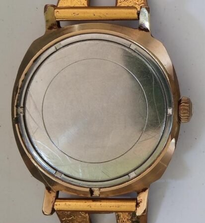 Avec un bracelet soviétique avec incrustation d’émail noir sur les maillons. Sur la boucle déployante, cette mention : ЛЧ.23.00