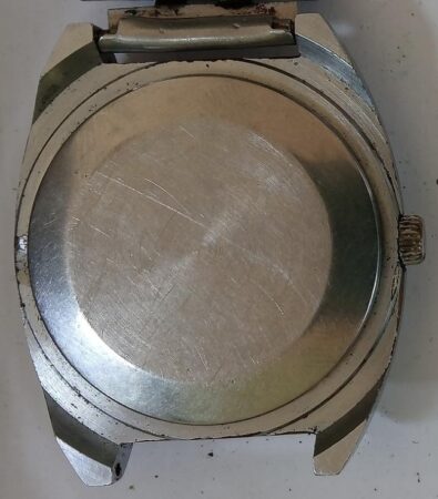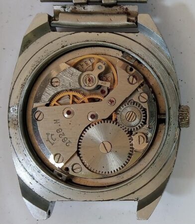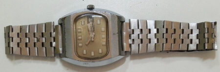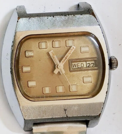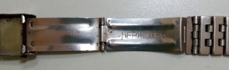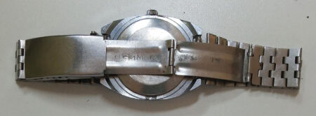Avec un bracelet soviétique, à boucle déployante estampée des initiales de la fabrique ZIM et de la mention « НЕРЖ.Ц.6р » (inox, prix 6 roubles).