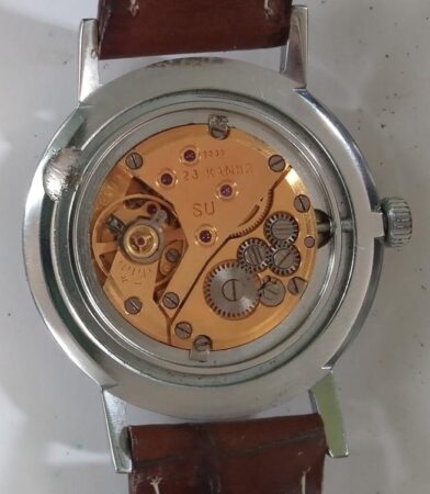Mentions sur le calibre : n° de série (961327) sur la platine, 2209, 23 камня (23 rubis) et SU sur le pont.