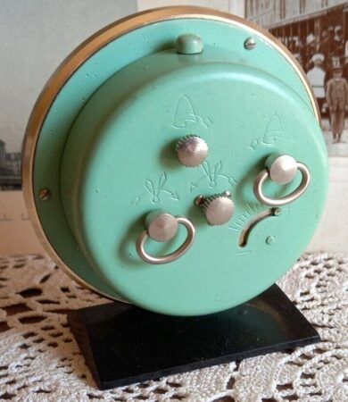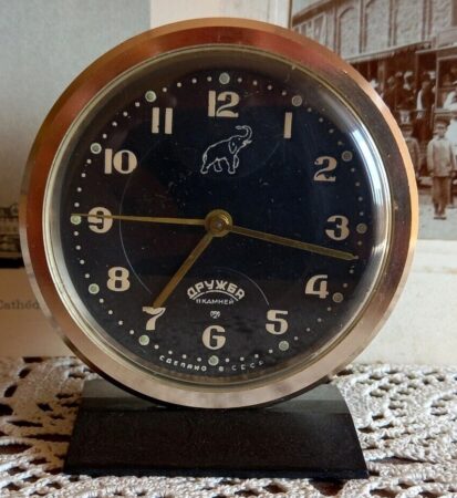 Petit réveil de marque de la 2e Fabrique de Montre de Moscou Marque Droujba, mécanisme Slava 5671 à 11 rubis.Produit dans les années ’7088 mm de haut, 78 mm de diamètre.