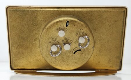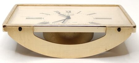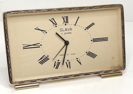 Réveil de la 2e Fabrique de Montres de Moscou, pour l’exportationMarque: SlavaMécanisme Slava 5671 à 11 rubis.Largeur: 140 mmProfondeur: 45 mmHauteur: 85 mmProduit dans les années ’70