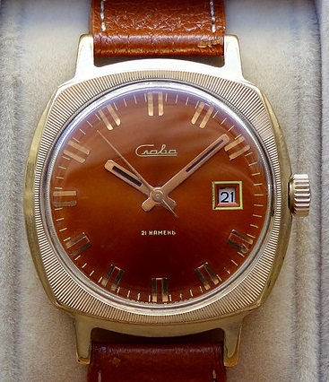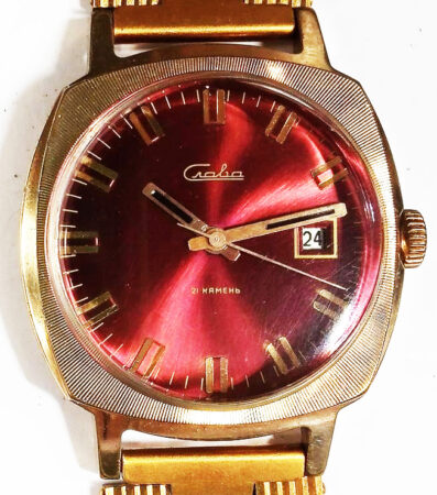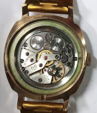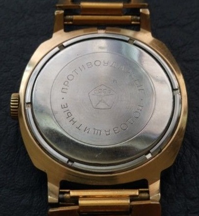Gravure sur le fond : водонепроницаemыe (étanche) et противоударные (antichoc) avec la marque de qualité de l’URSS. Perlage à l’intérieur.