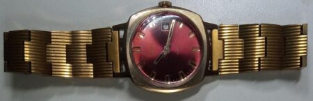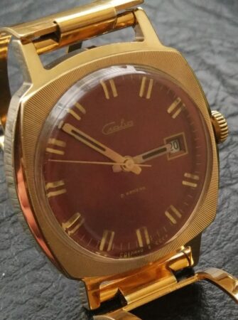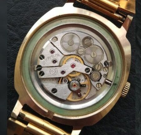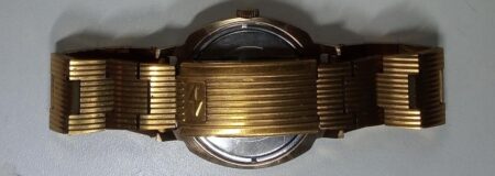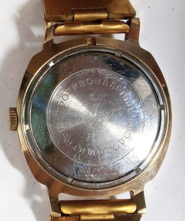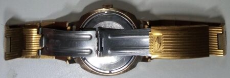 Avec un bracelet en acier doré, soviétique, à boucle déployante, avec le logo de la Fabrique de Pièces de Montres de Vitebsk à l’extérieur de la boucle et нерж (inox) à l’intérieur: