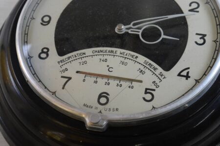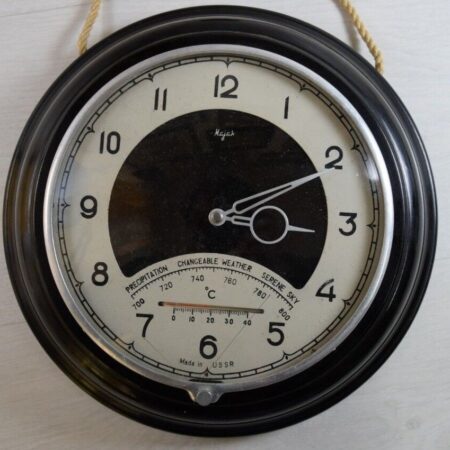 Horloge thermomètre et baromètre de la Fabrique horlogère de SerdobskMarque: MayakBoîtier de bakéliteNorme GOST 3309-75Mécanisme: 74122Remontage hebdomadaireDiamètre: 10,5 cmPoids: 1,268 Kg