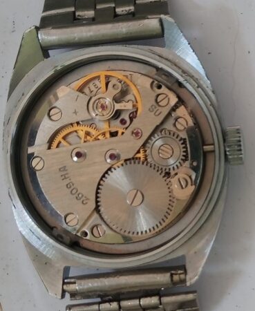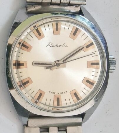 Mentions sur le calibre : n° de série (89975) et logo raketa (raquette symbolisée) sur la platine, 2609.HA et SU (Soviet Union) sur le pont.