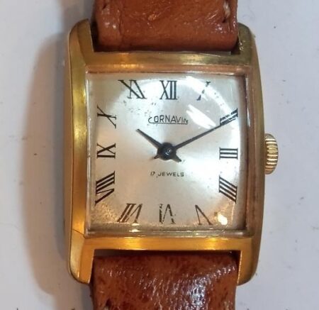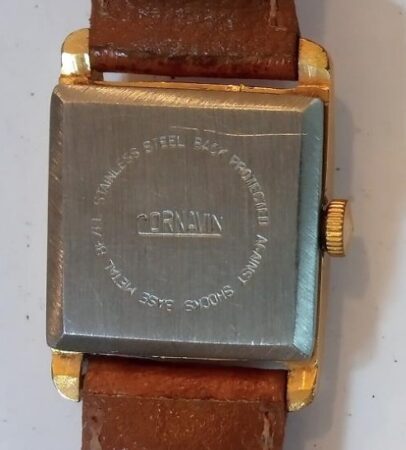 Gravure sur le fond : STAINLESS STEEL BACK PROTECTION en demi-cercle au dessus ; AGAINST SHOCKS BASE METAL BEZEL en demi cercle au dessous ; CORNAVIN au centre.