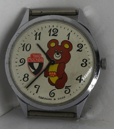 Motif du cadran : l’ourson olympique Michka flaqué du logo en écu de la Fabrique avec la mention MOCKBA 1980.