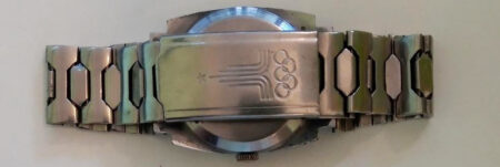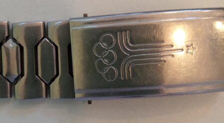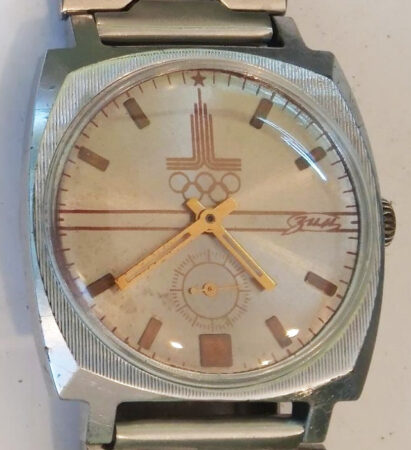 Montre bracelet, mécanique, à petite seconde, de la Fabrique de Montres Maslenikov (ZIM) célébrant les Jeux olympiques de Moscou de 1980 avec le logo des Jeux.
