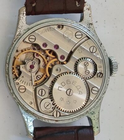 Mentions sur le calibre : n° de série (84788) et 1-52 (1er trimestre 1952), logo de la fabrique (ЧЧЗ dans un cercle entre deux triple traits) sur un pont et 15 камней sur un autre, POBEDA et trois étoiles sur le rochet. Côtes de Genève.