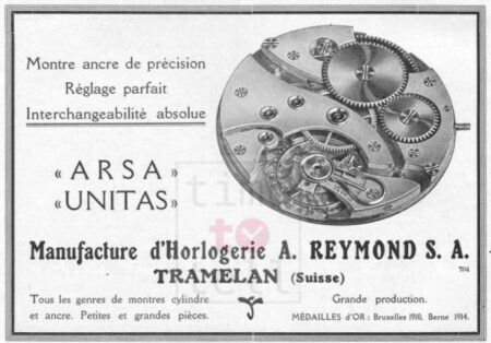 La production de mouvements commence en 1919, celle de montres en 1920. La société est sévèrement touchée par la crise en 1921 et est rachetée en 1926 par la société Auguste Reymond SA, à Tramelan (marque ARSA). Celle-ci avait pour origine Auguste Reymond, qui avait créé sa Fabrique d’Horlogerie, également à Tramelan, en 1898. La maison grandit vite et devient Manufacture en 1906 en produisant ses propres ébauches d’abord aux Bioux puis à Tramelan. En 1918 l’entreprise devient société anonyme sous le nom A. Reymond S.A. ou ARSA et en 1926 donc, elle rachète la fabrique Unitas.
