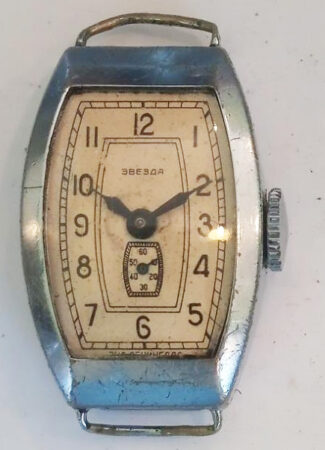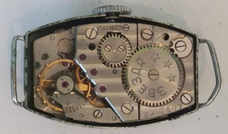 Mécanisme : Ce modèle n’avait alors pas de nom, c’est de mécanisme pour Zvezda (le rochet est marqué ainsi) ; c’est version soviétique du Lip T18 à 15 rubis qui sera appelé ultérieurement 1802.
