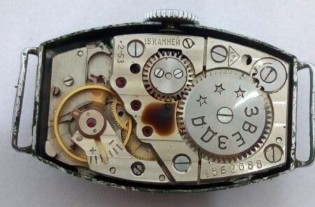 Mécanisme : Ce modèle n’avait alors pas de nom, c’est de mécanisme pour Zvezda (le rochet est marqué ainsi) ; c’est version soviétique du Lip T18 à 15 rubis qui sera appelé ultérieurement 1802.
