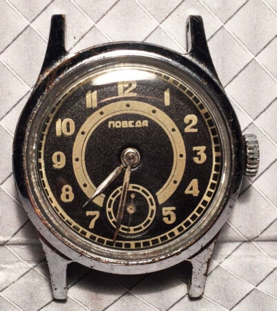 Mentions sur le calibre : n° de série (95937) et 1-57 (1er trimestre 1957), logo de la fabrique (ЧЧЗ dans un cercle entre deux triple traits) sur un pont et ЗИМ et 15 камней sur un autre, POBEDA et trois étoiles sur le rochet. Côtes de Genève.
