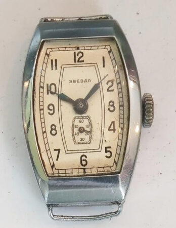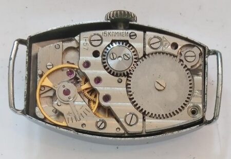 Mécanisme : Ce modèle n’avait alors pas de nom, c’est de mécanisme pour Zvezda (le rochet est marqué ainsi) ; c’est version soviétique du Lip T18 à 15 rubis qui sera appelé ultérieurement 1802.