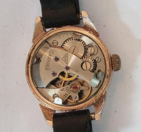 Mentions sur le calibre : n° de série (36791) sur un pont, premier logo de la fabrique de Penza (initiales ПЧЗ inscrites dans un triangle sur sa pointe) et et 15 камней (15 rubis) sur un autre.