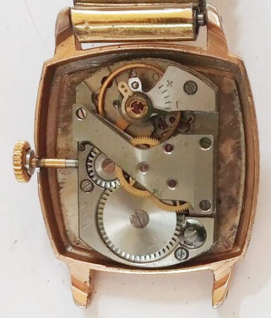 Mentions sur le calibre : n° de série (0946638) sur la tranche, premier logo de la fabrique de Penza (initiales ПЧЗ inscrites dans un triangle sur sa pointe) sur le pont