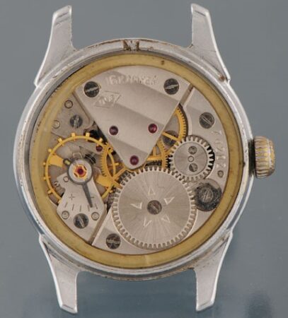 Mentions sur le calibre : N° de série (74202) sur un pont, 16 камней, et l’ancien logo de la fabrique (en losange) sur un autre. Côtes de Genève.