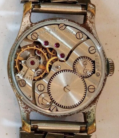 Mentions sur le calibre : ЗИМ et 15 камня sur un pont, n° de série (39784) sur un autre. Côtes de Genève.