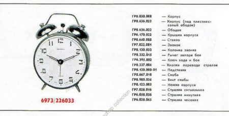 Réveil-matin produit pour l’exportartion par la Fabrique d’Horloges d’Orel.Modèle 6973/226033Marque: JantarMécanisme: 6973 à 4 rubisHauteur: 159mmLargeur: 113mmProfondeur: 72mm